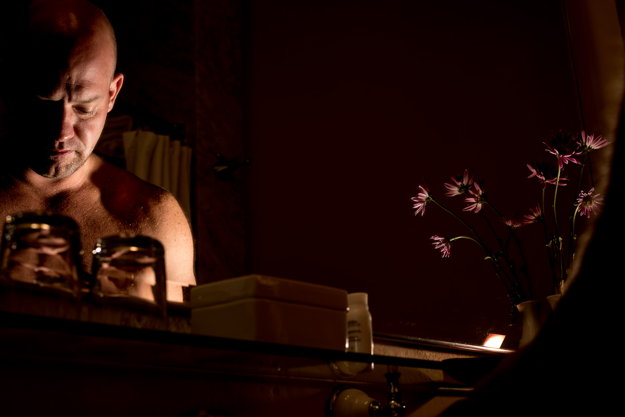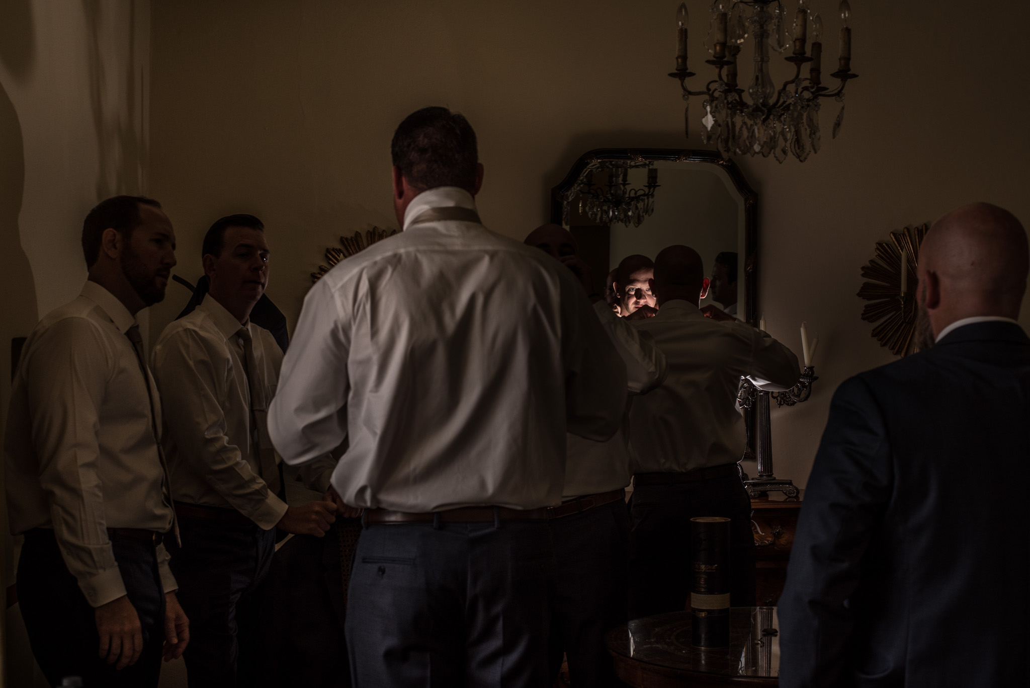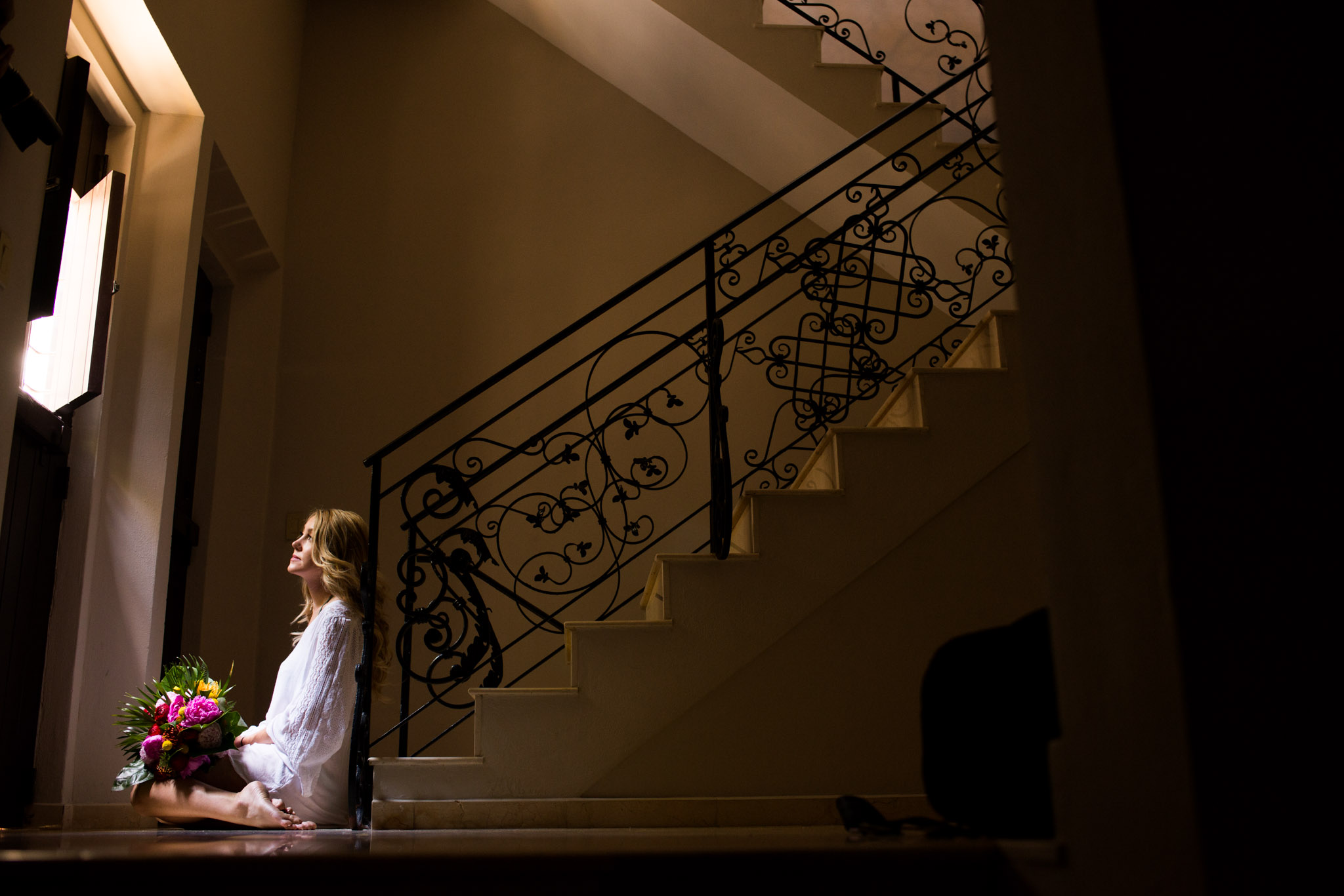 On wedding day Jene was getting ready at a house a couple blocks away from El Convento San Juan, and it was a very classic Old San Juan style home, built with completely closing large wooden doors and fixed shutters with wrought iron grates over the top. We did take the time to do some nice portraits of Jene in front of the light from one of these doors, and we are in love with the dramatic look of these images. Dennis got ready at El Convento, first hanging with the boys at the bar while other were at the pool, and finally moving to the bridal suite, where he and Jene would stay that night. The bridal suite in El Convento San Juan is really a gorgeous location for natural light photography. There is a large window inset with walls over a foot thick, in the fortified style that is common in Old San Juan. We decided on groomsman photos in front of the main window to take advantage of the rich natural light.