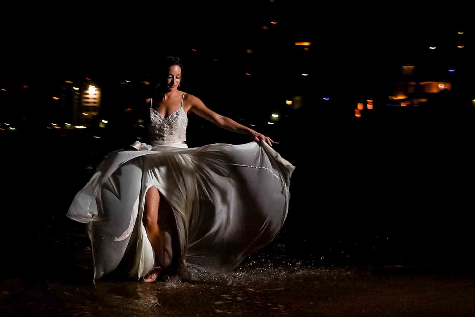 La Concha San Juan is right on the beach, so to finish out the night we all went down onto the sand just after midnight, to have some fun and take a sparkler send off photo. After explaining to everyone the three important things for them to know during the photo – Look at the bride and groom, keep your sparklers up high, and group up behind the couple as they pass by, we fired up their extra large sparklers and took some really exciting photos. Afterwards Jennifer and Frances had an impromptu trash the dress (it was a second dress – she had changed into a more comfortable second dress earlier in the night) shoot at night on the beach. We had a blast, and Jennifer did too. As we walked back to the beach we saw a surprised and happy look on Brenda Garcia (their wedding coordinators) face. My guess is not too many wedding photographers she works with at La Concha San Juan are jumping into the ocean past midnight on wedding night very often!