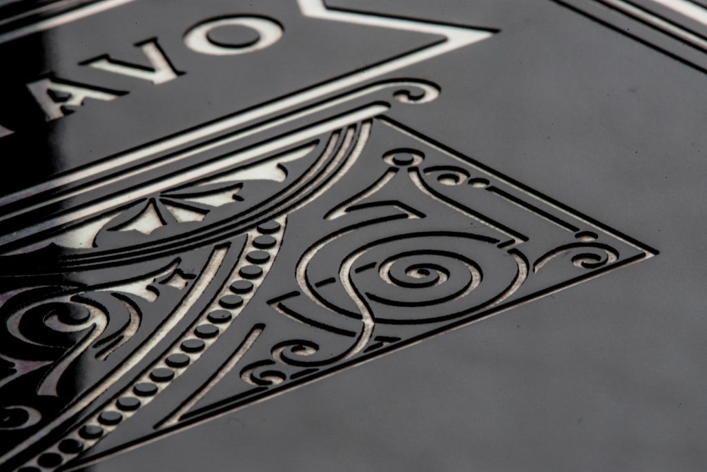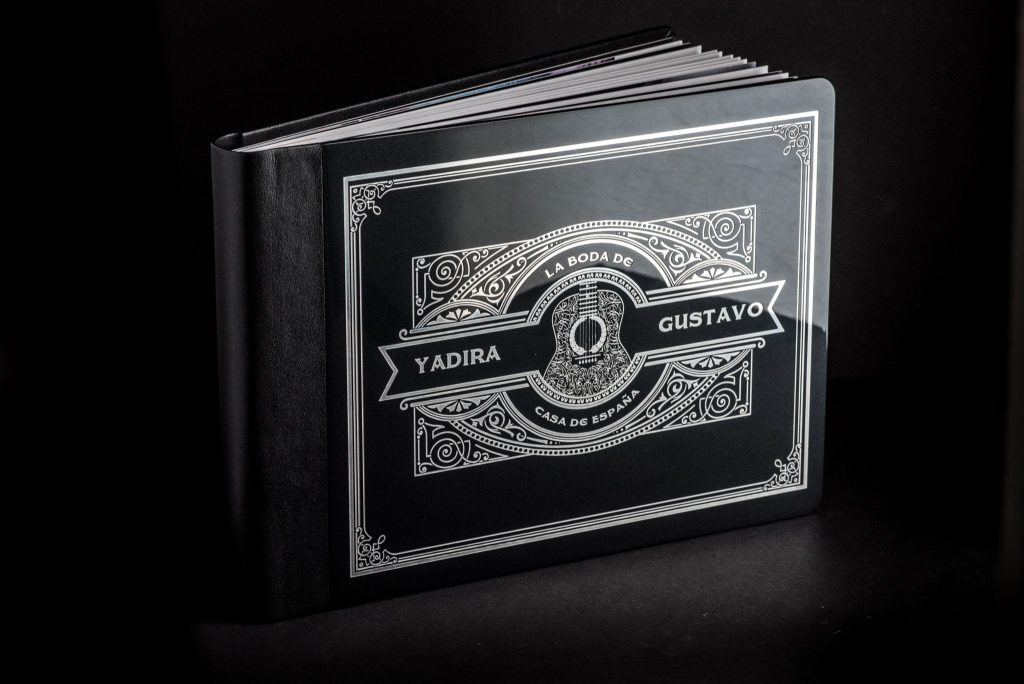 Frances really did a stellar job with her design of this beautiful album, and I know she had fun finding inspiration from traditional Rock n’ Roll elements, and other thematic things like whiskey labels and classic cars. She chose a solid metal cover coated with a thick high gloss enamel in black. Next, the cover design was etched into the enamel using laser engraving, leaving a recessed, fairly deeply engraved design in the enamel. This book just *feels* like the two of them, and I think does a good job of conveying the black, metal, and somewhat rebel-ish feel of their wedding day.